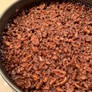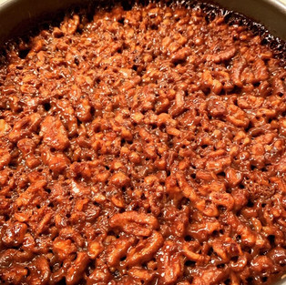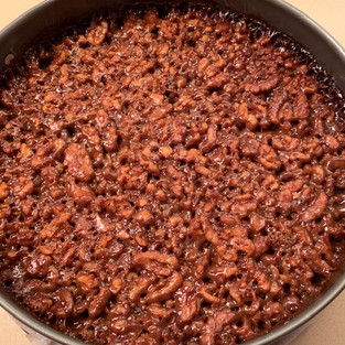 · העוגה מוכנה כאשר תערובת האגוזים המתוקה התקרשה וקיבלה צבע חום ענבר. זמן יותר מדויק ? כחצי שעה.